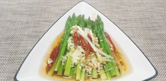 食材:芦笋、辣椒、大蒜、葱白、白糖、生抽、蚝油、香醋