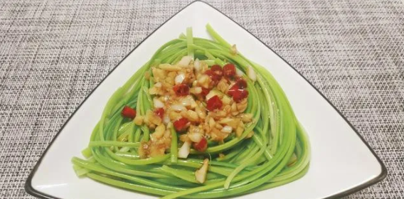 7、把芦笋摆放在盘中,蒜末、葱丝、辣椒丝码放在上方